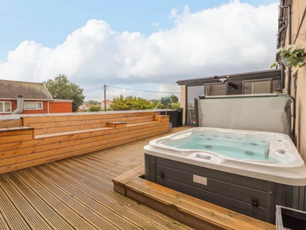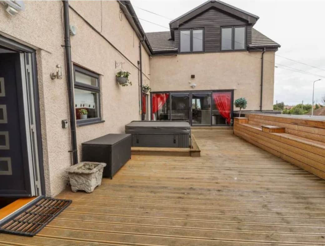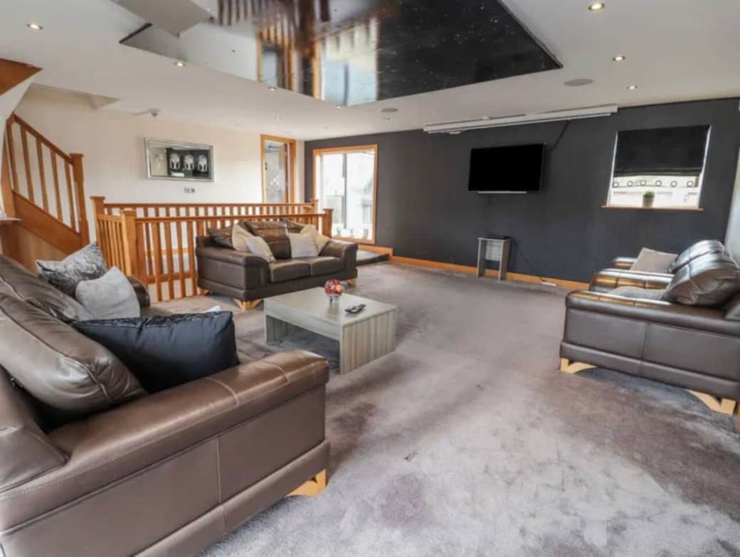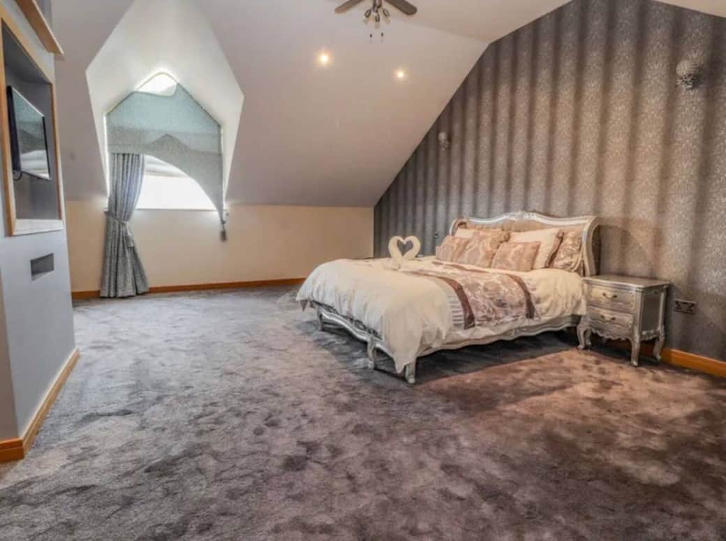 In the main room there is a super king size bed with a sofa bed there is a room attached to the main bedroom that has two single beds alone side a bathroom with a large bath and double shower and double sink and dressing room