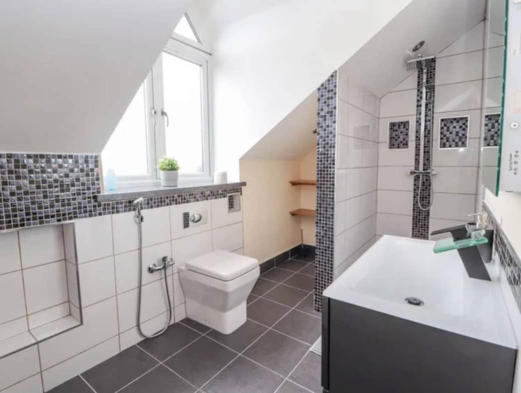 On the first floor there is a bedroom which has two single beds and one double bed this is next door to the main bathroom